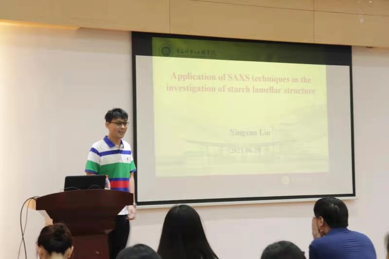 刘兴训老师就近期项目小角X光散射技术解析淀粉结构的研究过程与老师、师弟师妹们分享。刘兴训教授表示进行科研项目并不容易,他们为了实验数据需要24小时不间断轮流进行工作,得到约1000个数据后花费2年时间分析数据写文章,最后将研究成果与生活中的饮食结合惠及群众。其次,刘兴训老师就南京财经大学的硕士研究生的招生情况包括学科发展历程、师资力量、科研情况、奖学金政策、学生活动等与师弟师妹们做了详细介绍。