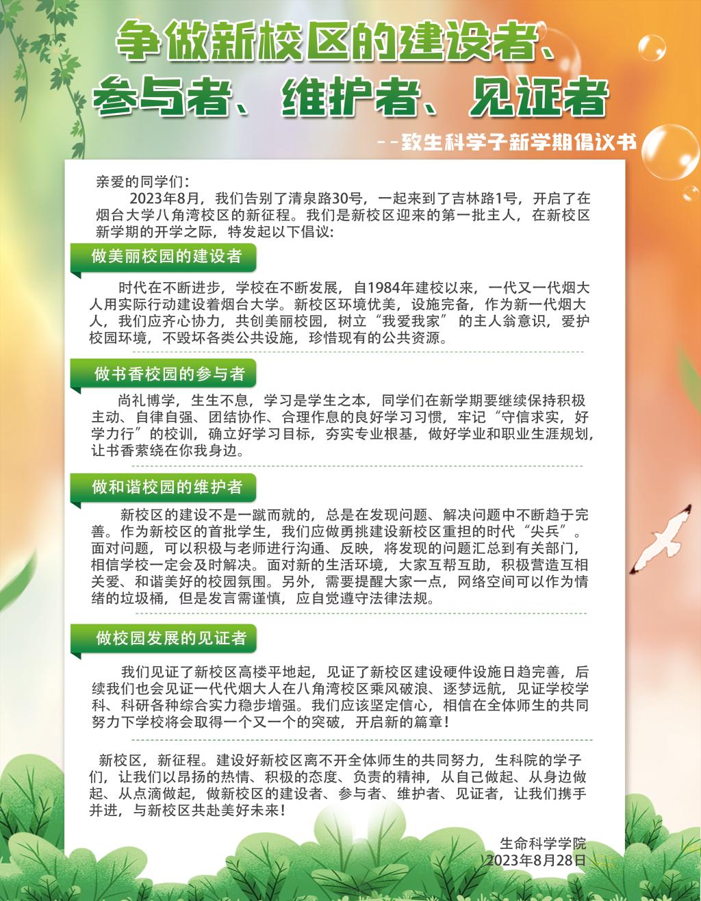2023年8月,我们告别了清泉路30号,一起来到了吉林路1号,开启了在aa3044永利集团八角湾校区的新征程。我们是新校区迎来的第一批主人,在新校区新学期的开学之际,特发起以下倡议: